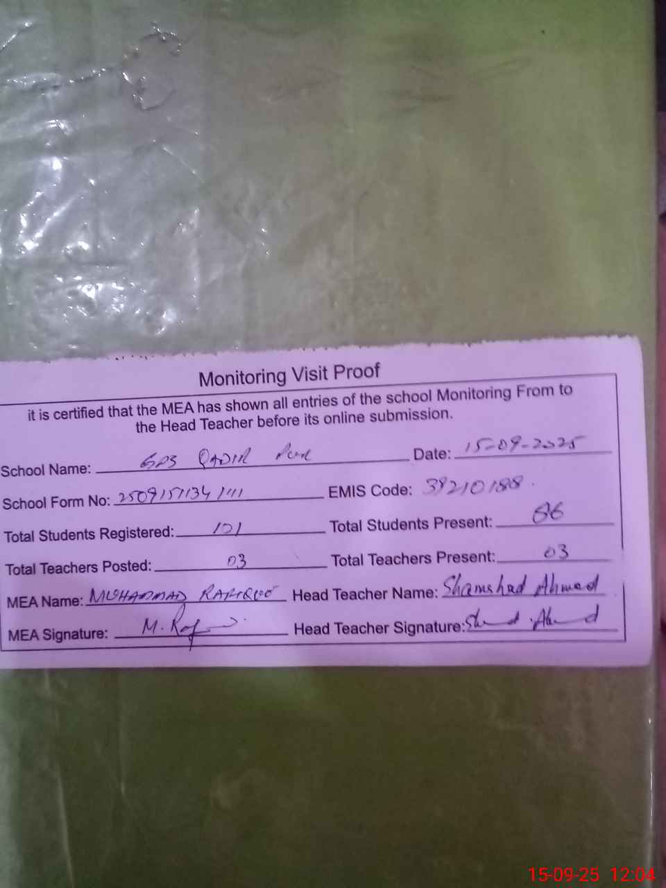 | Attendance Register | Head Teacher | MEA with School | Visit Proof |