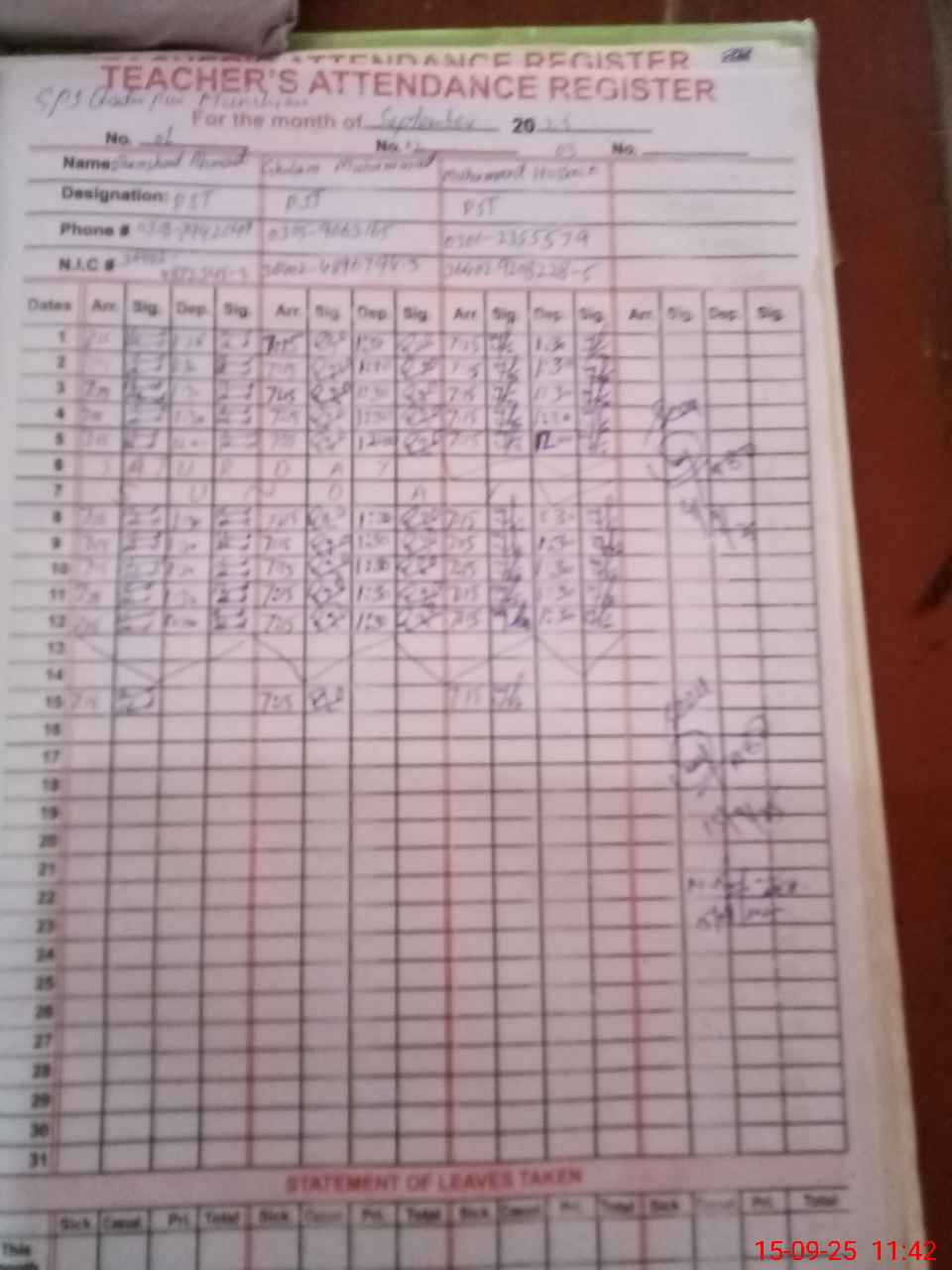 | CNIC | Full Name | Designation | R/C | Absence during last cal. month |