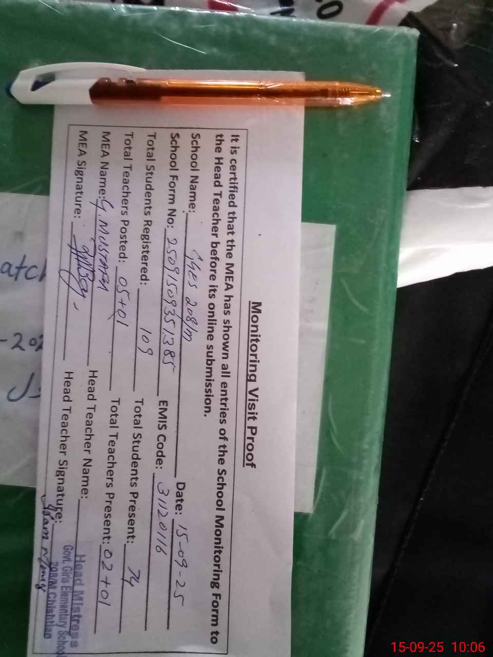 | Attendance Register | Head Teacher | MEA with School | Visit Proof |
