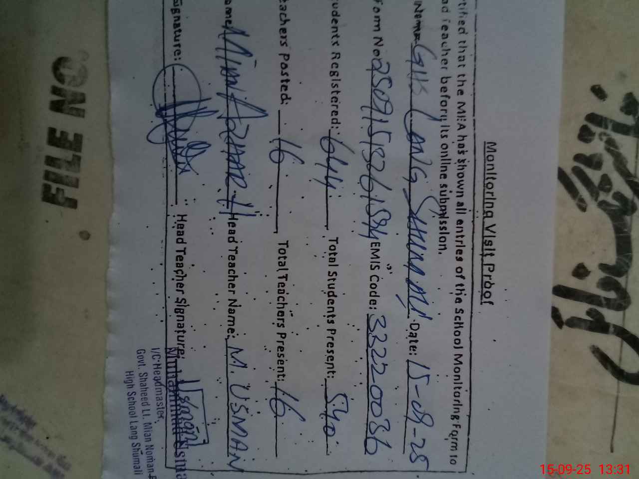 | EMIS Code: 33220036 | Name of School: GOVT. SHAHEED LT. MIAN NOMAN RAZA HIGH SCHOOL, LANG SHUMALI | |||