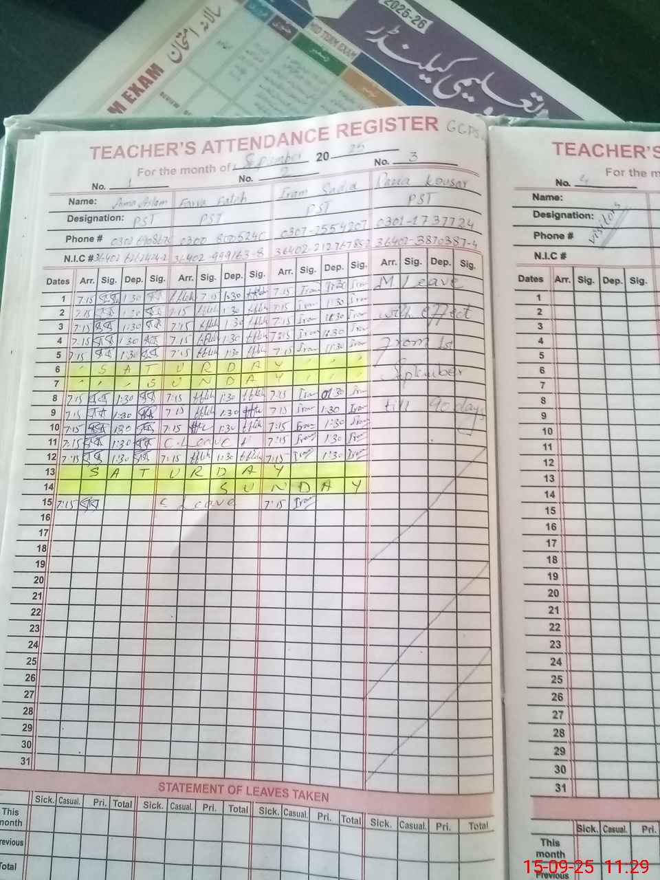 | CNIC | Full Name | Designation | R/C | Absence During Last Calender Month |