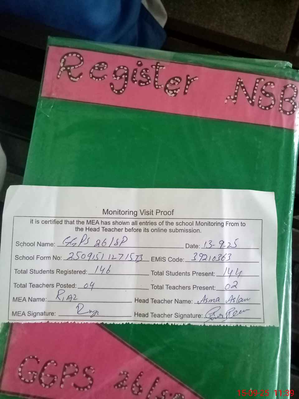 | Attendance Register | Head Teacher | MEA with School | Visit Proof |