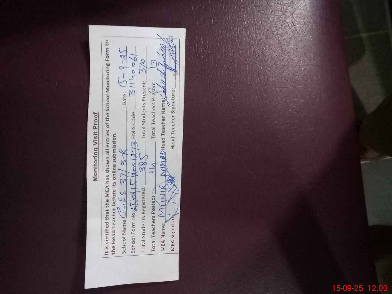 | Attendance Register | Head Teacher | MEA with School | Visit Proof |