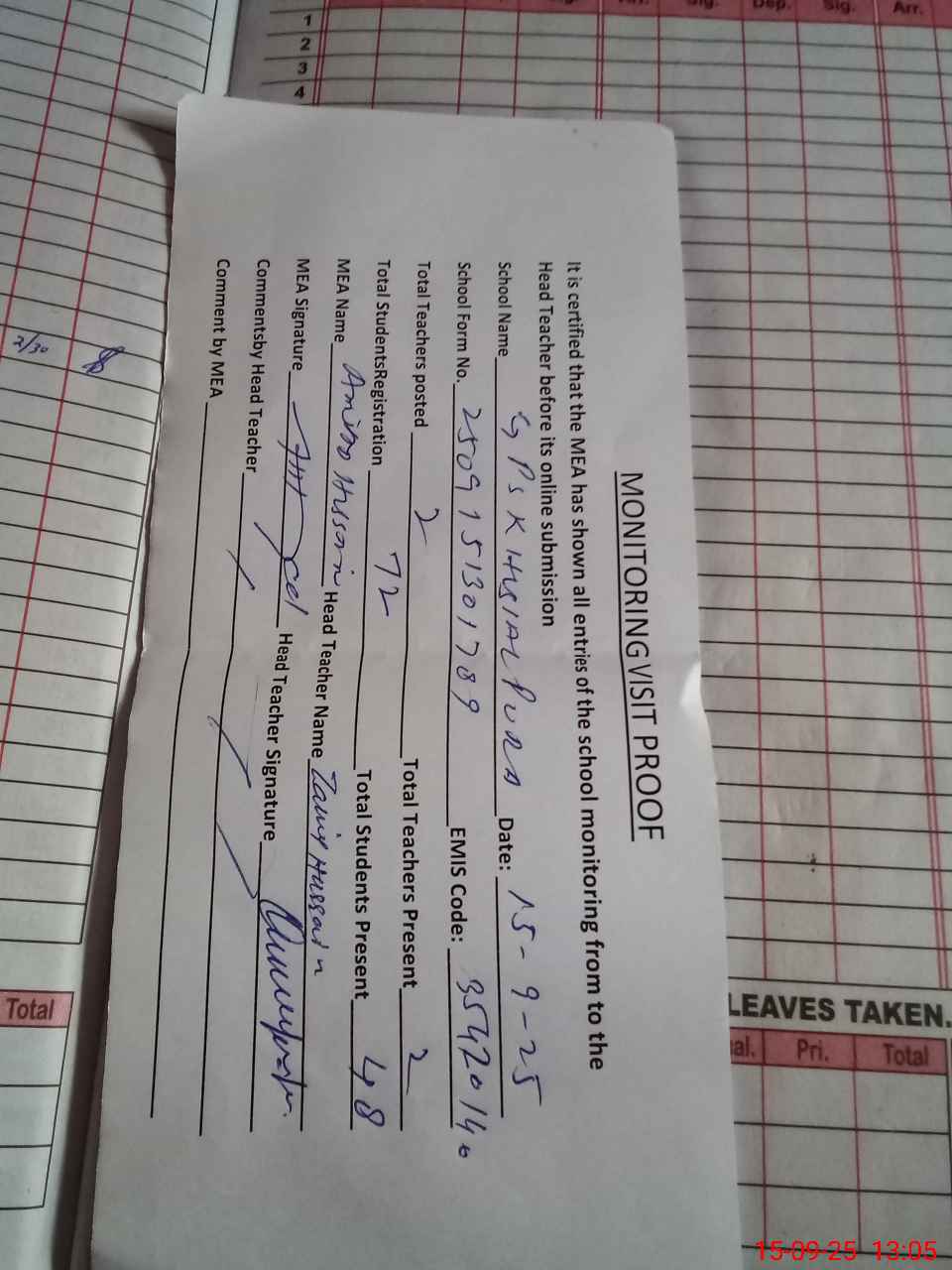 | Attendance Register | Head Teacher | MEA with School | Visit Proof |