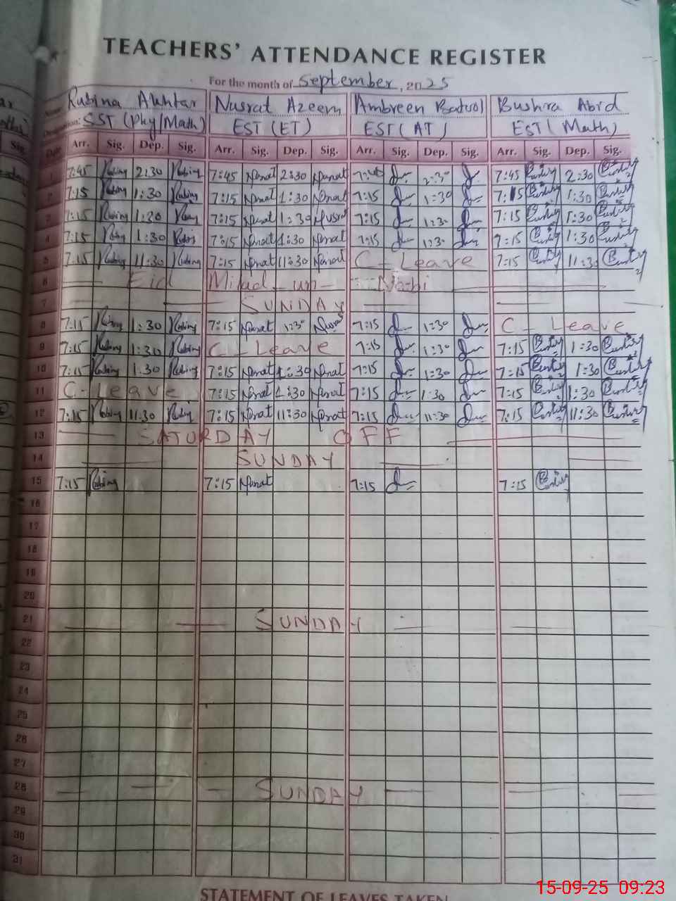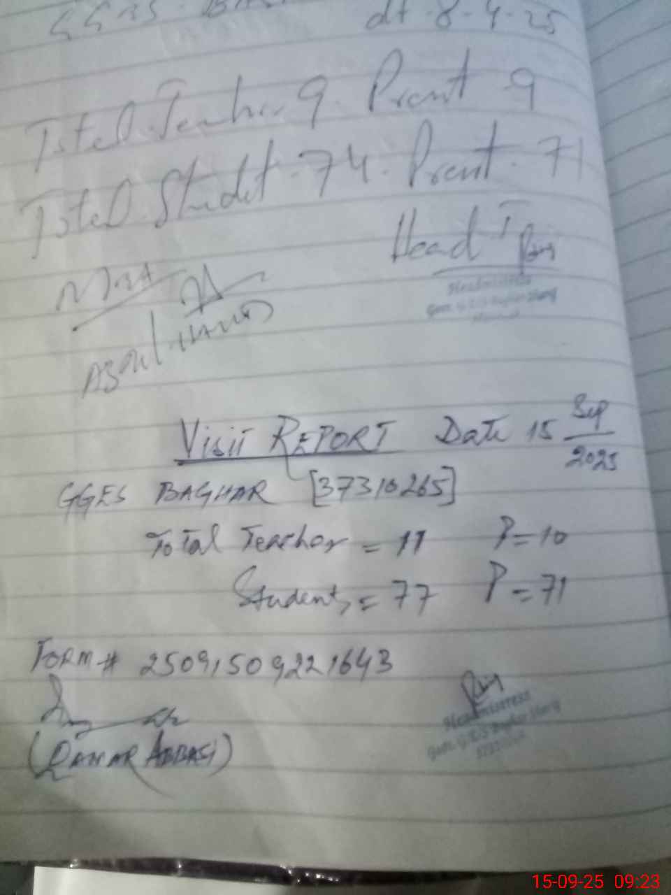 | Attendance Register | Head Teacher | MEA with School | Visit Proof |