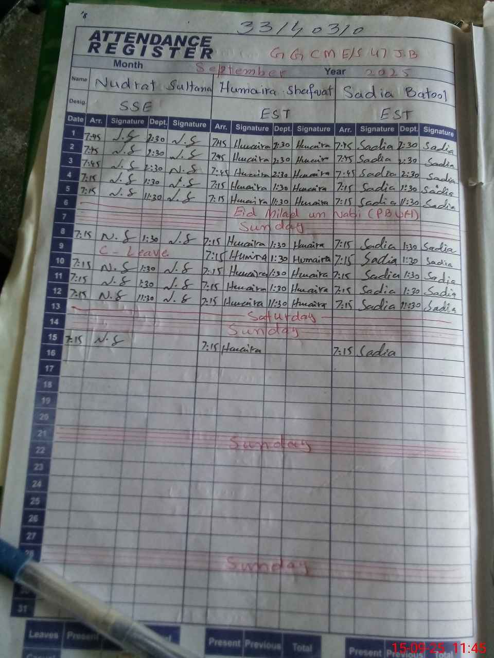 | Monitoring Date: 15-09-2025 | Start Time: 15-09-2025 10:54 AM | End Time: 15-09-2025 11:47 AM | Name of MEA: M.RI**** AH**** | |