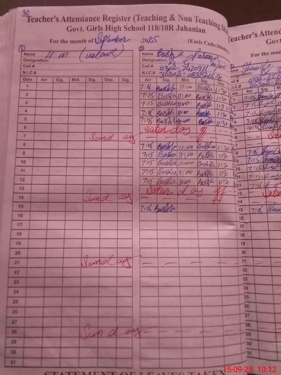 | CNIC | Full Name | Designation | R/C | Absence During Last Calender Month |
