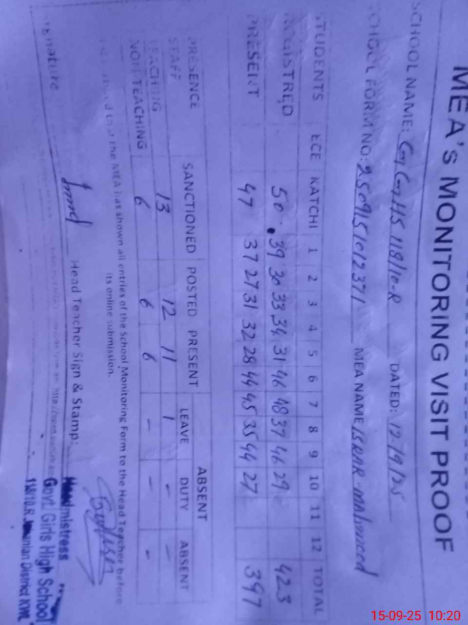 | Attendance Register | Head Teacher | MEA with School | Visit Proof |