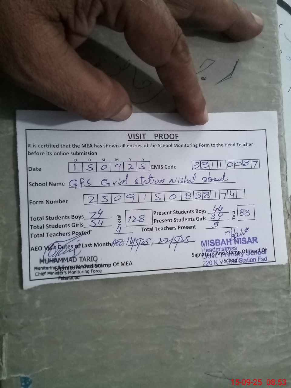 | Attendance Register | Head Teacher | MEA with School | Visit Proof |