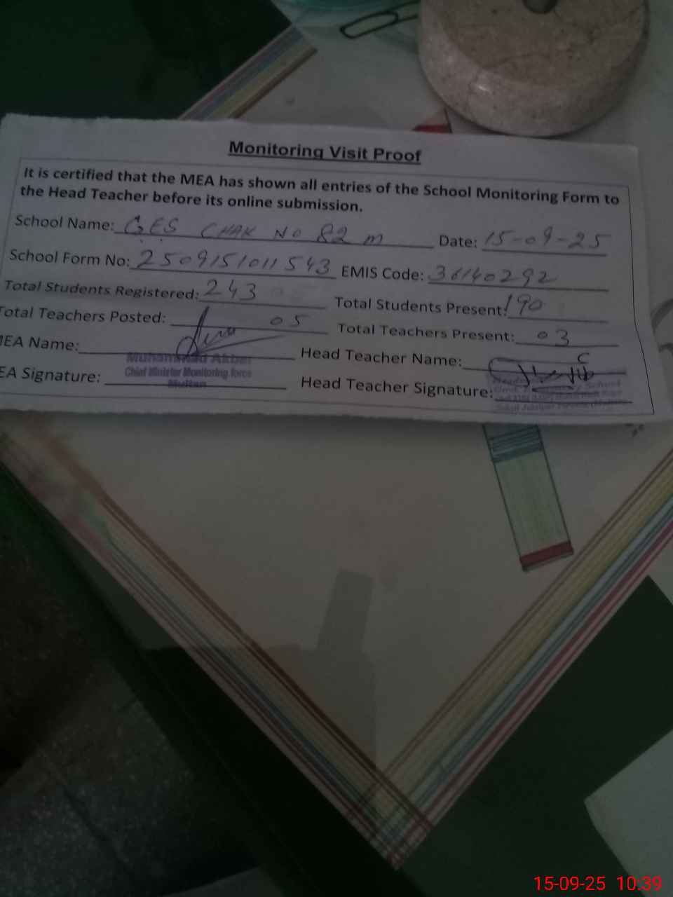| Attendance Register | Head Teacher | MEA with School | Visit Proof |