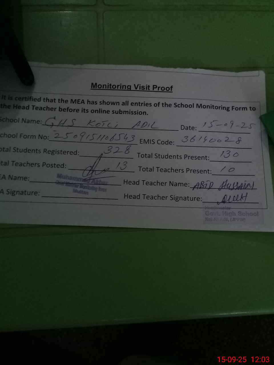 | Attendance Register | Head Teacher | MEA with School | Visit Proof |