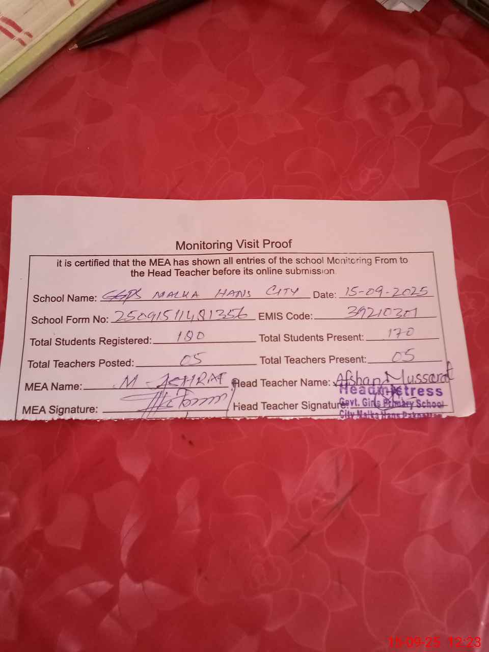 | EMIS Code: 39210301 | Name of School: GGPS MALKA HANS CITY | |||