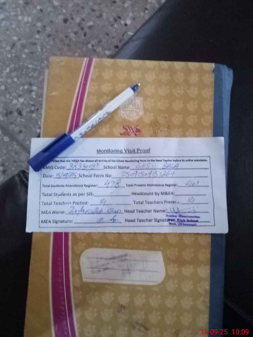 | Attendance Register | Head Teacher | MEA with School | Visit Proof |