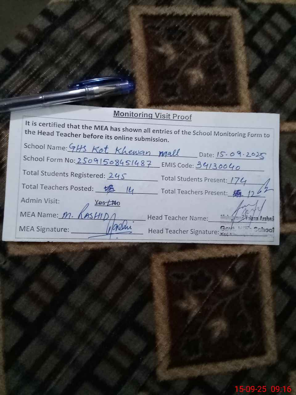 | EMIS Code: 34130040 | Name of School: GHS KOT KHEWAN MALL | |||