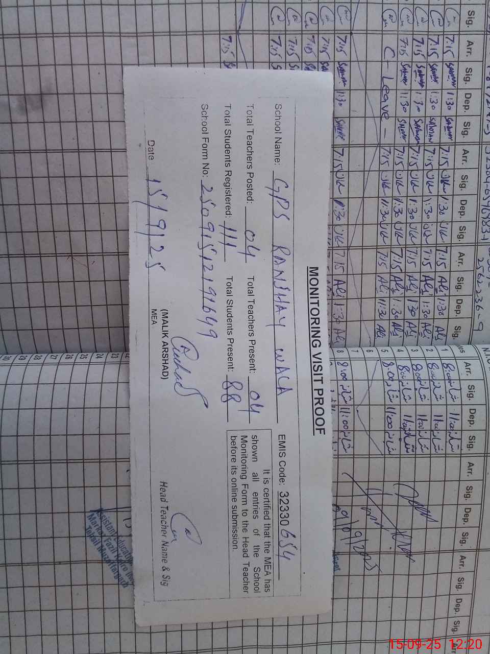 | Attendance Register | Head Teacher | MEA with School | Visit Proof |