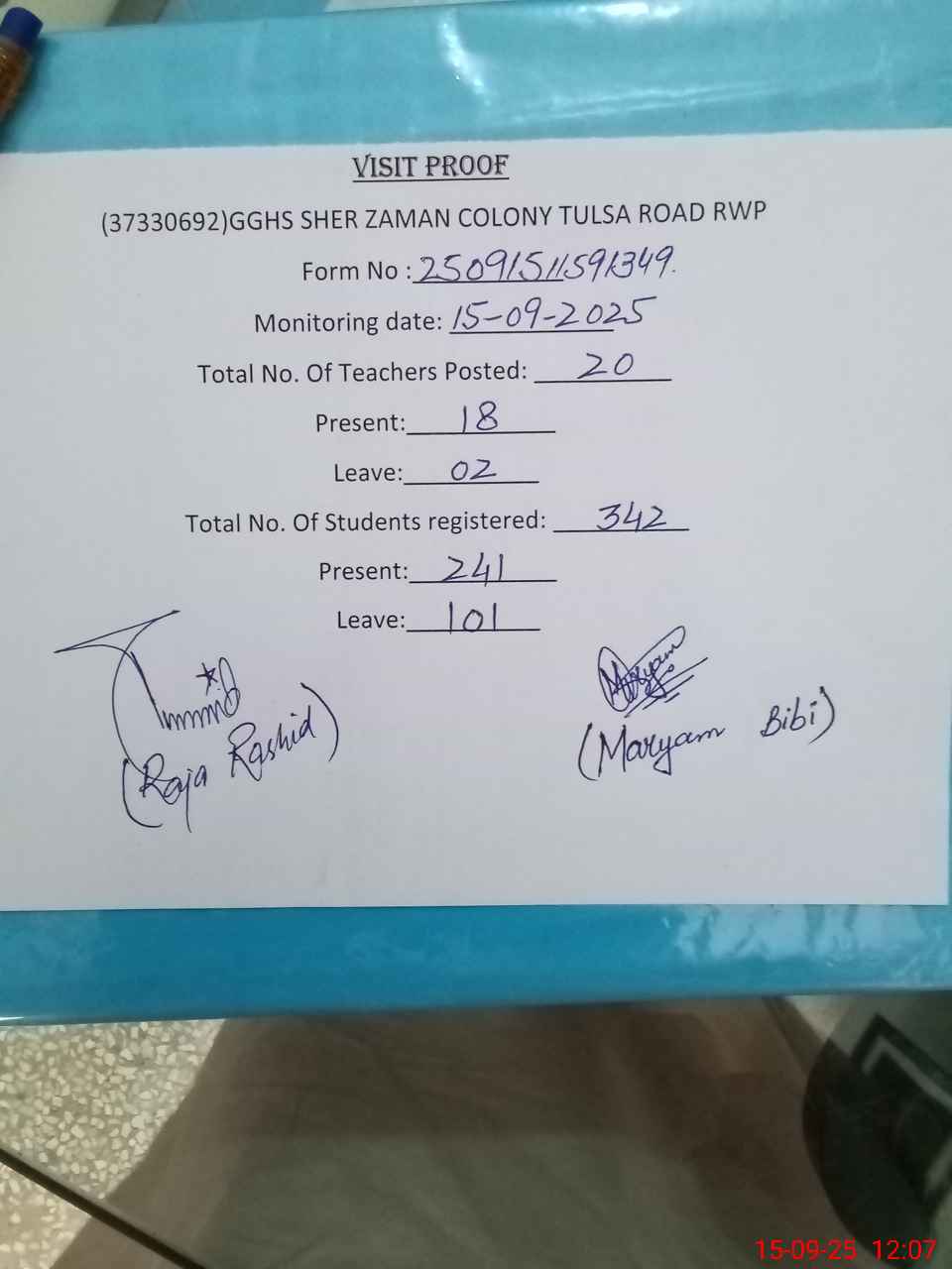 | Attendance Register | Head Teacher | MEA with School | Visit Proof |