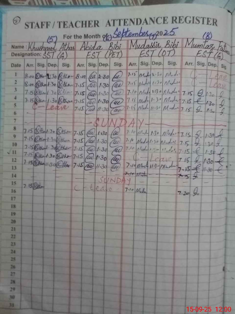 | CNIC | Full Name | Designation | R/C | Absence During Last Calender Month |