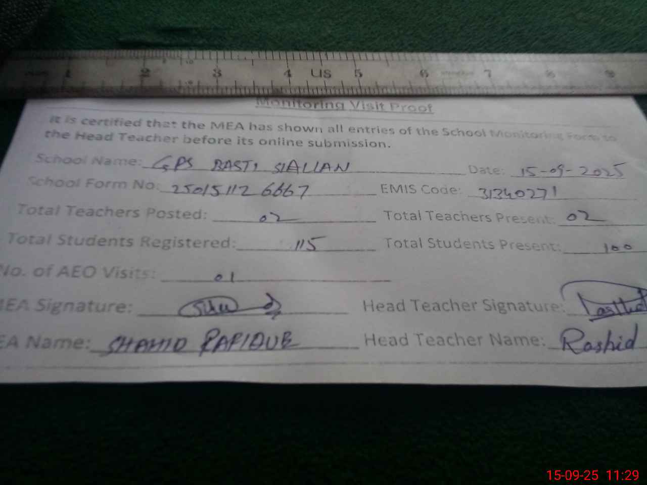 | Attendance Register | Head Teacher | MEA with School | Visit Proof |