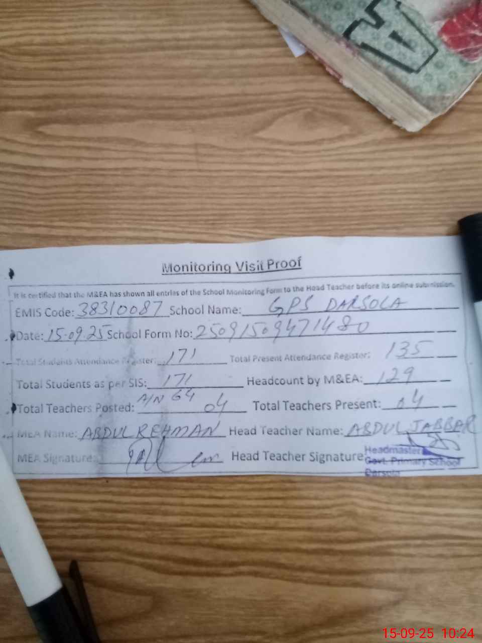 | EMIS Code: 38310087 | Name of School: GPS DARSOLA P/O AWANAN WALA | |||