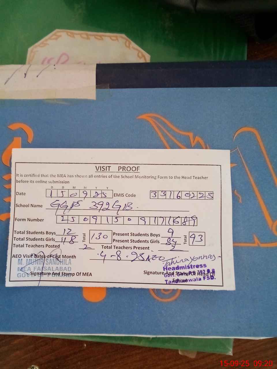 | EMIS Code: 33160225 | Name of School: GGPS CHAK 392 GB TANDLIANWALA | |||