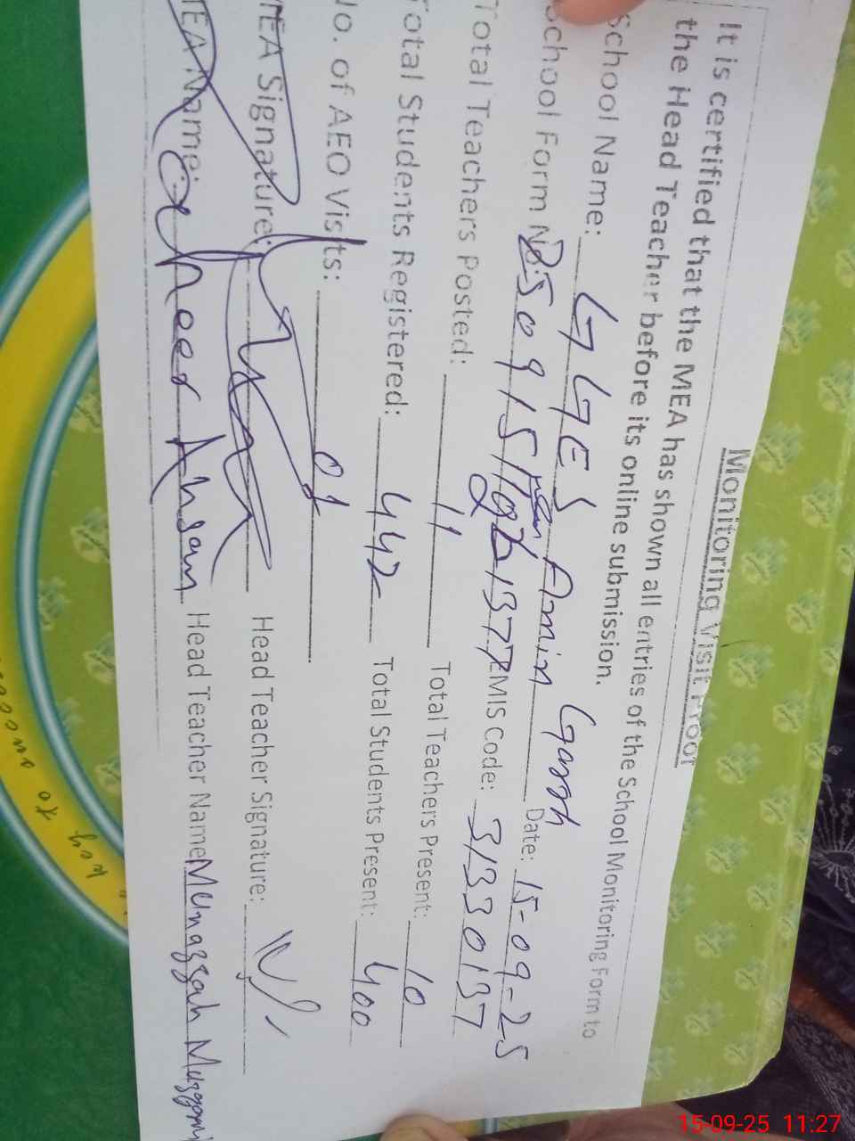 | Attendance Register | Head Teacher | MEA with School | Visit Proof |