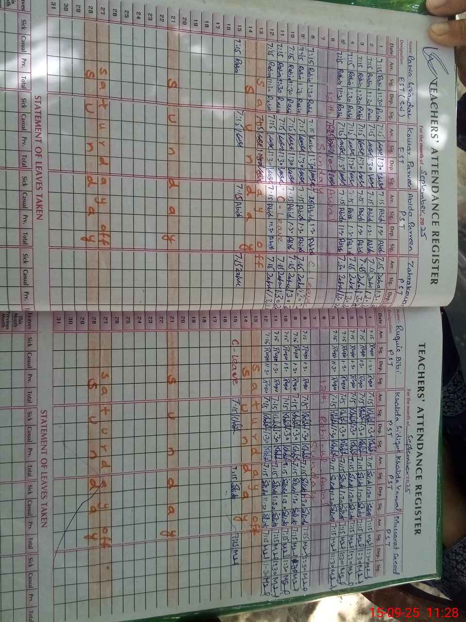 | Total no. of Classrooms: 15 No. of Classrooms Used for Teaching: 9 No. of Classrooms Storing Old Furniture, FTBs, etc: 0Comments if Any: Sir teachers and students attendance on sis not carried out |