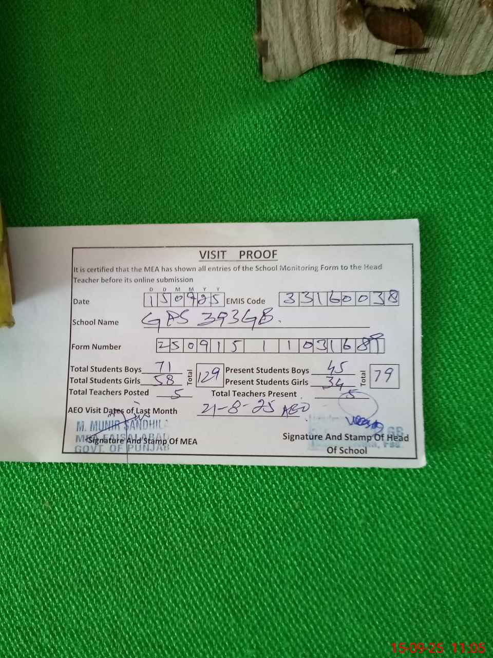 | Attendance Register | Head Teacher | MEA with School | Visit Proof |
