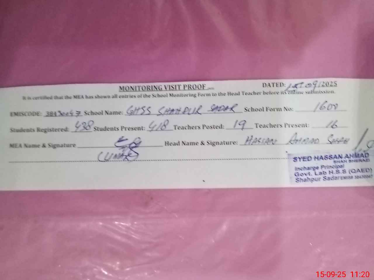 | EMIS Code: 38430047 | Name of School: GHSS SHAHPUR SADAR | |||