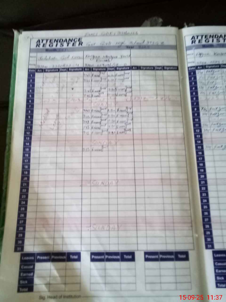 | No. of Students Present - Female | 0 | 0 | 26 | 28 | 26 | 22 | 14 | 14 | 24 | 43 | 30 | 31 | 29 | 287 | ||