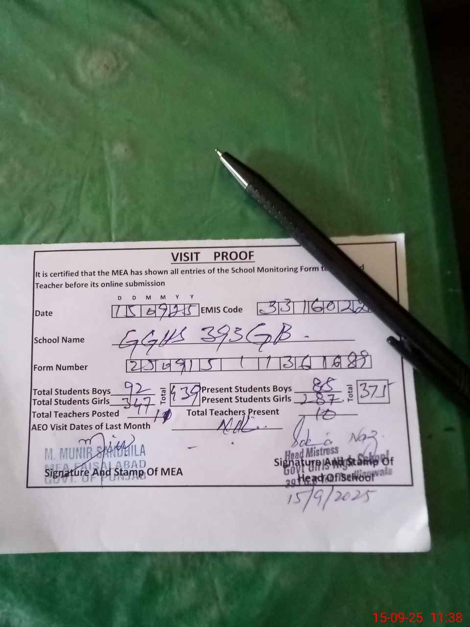 | EMIS Code: 33160226 | Name of School: GGHS CHAK 393 GB TANDLIANWALA | |||