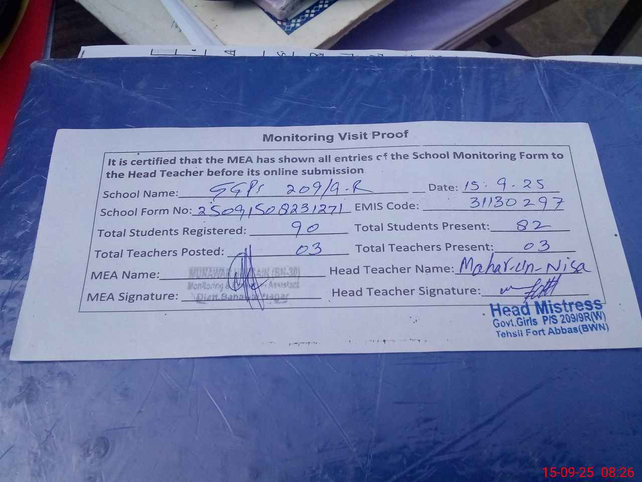 | Attendance Register | Head Teacher | MEA with School | Visit Proof |