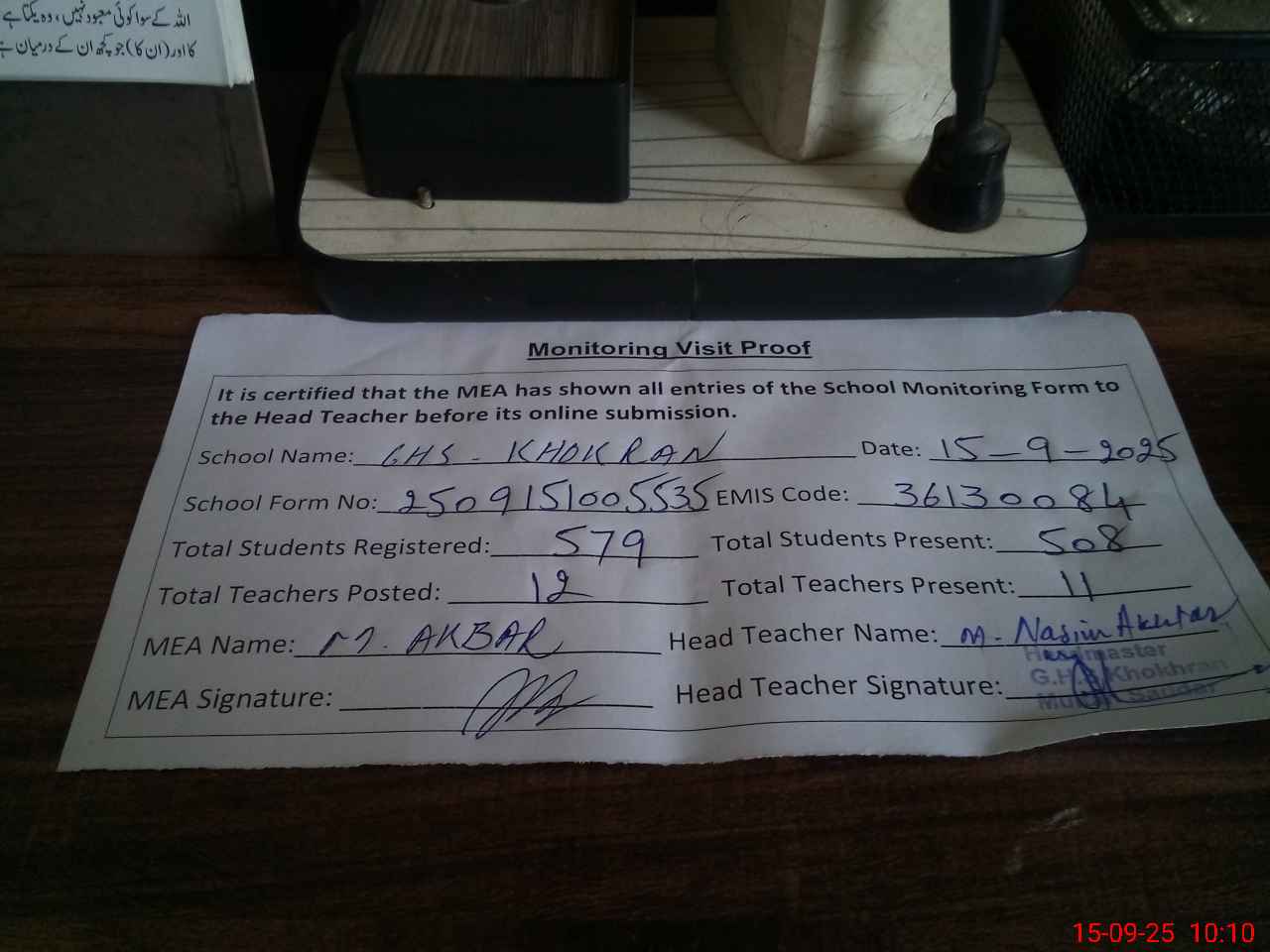 | Attendance Register | Head Teacher | MEA with School | Visit Proof |