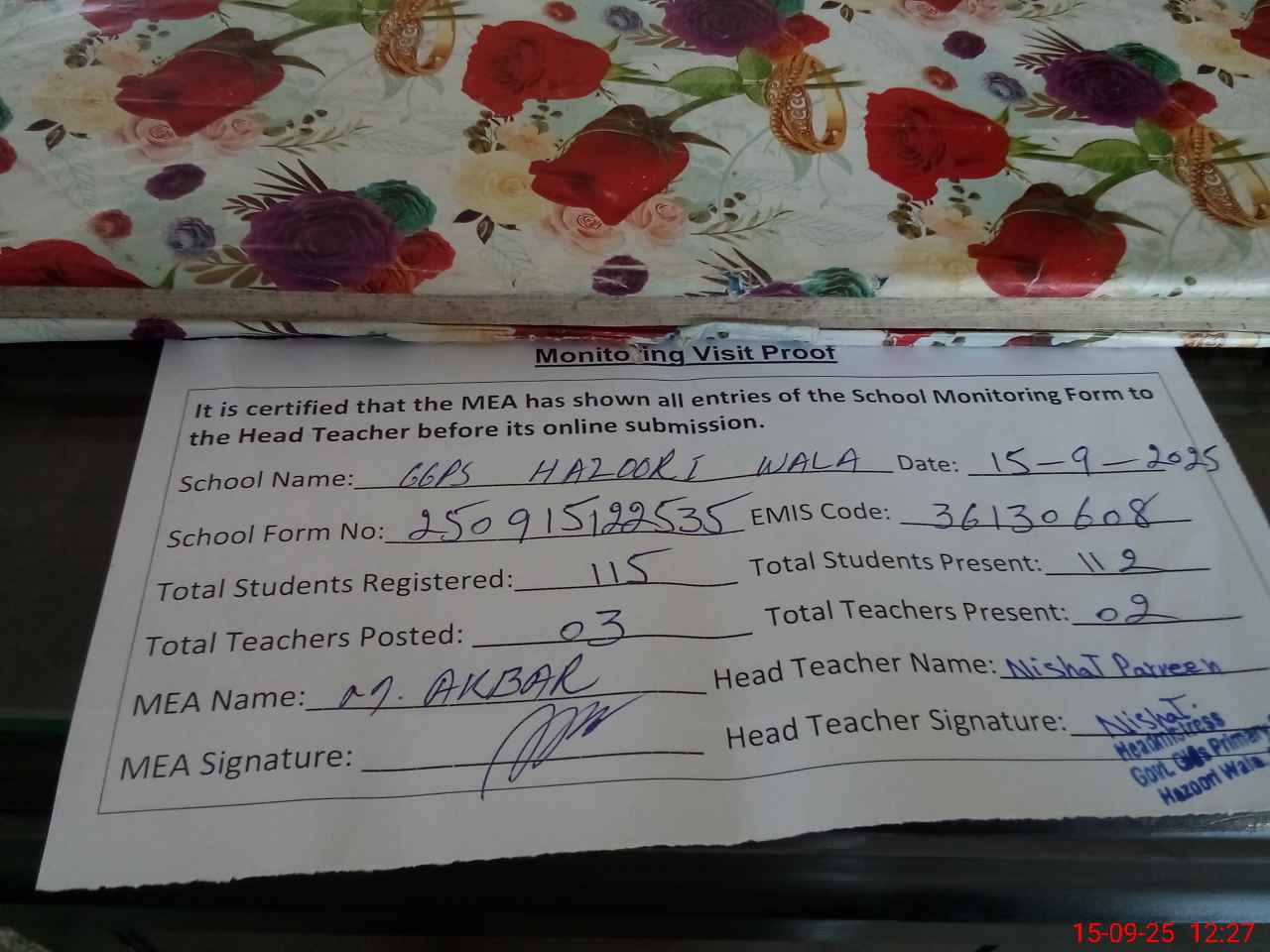 | Attendance Register | Head Teacher | MEA with School | Visit Proof |