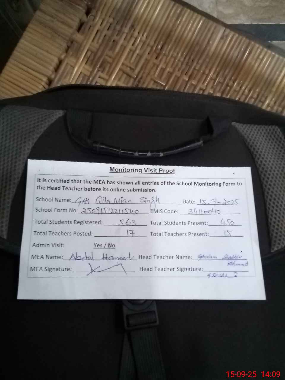 | Attendance Register | Head Teacher | MEA with School | Visit Proof |