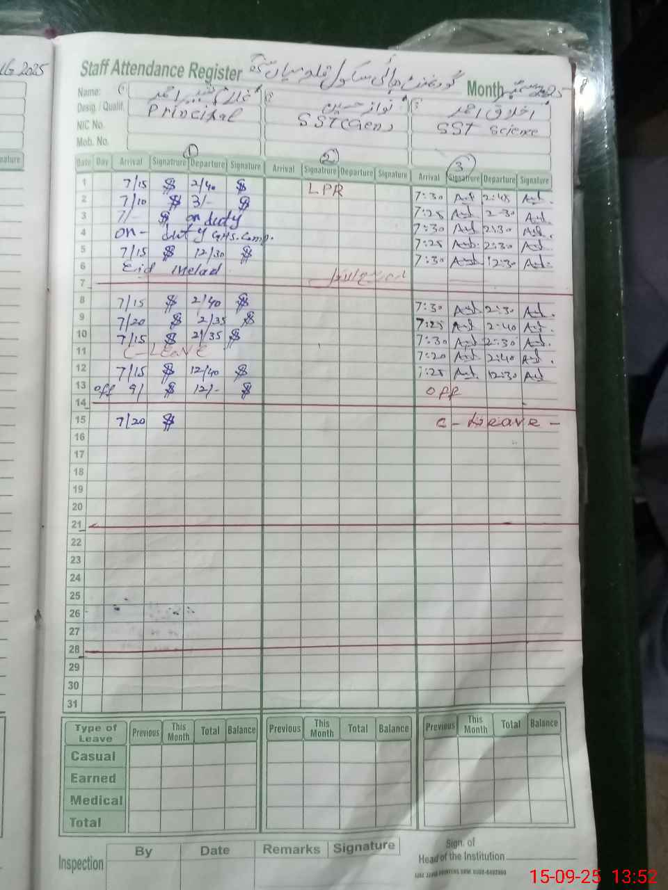 | CNIC | Full Name | Designation | R/C | Absence During Last Calender Month |