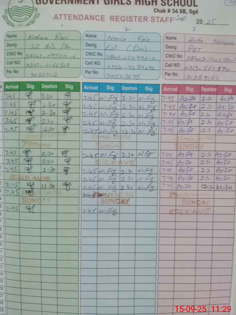 | CNIC | Full Name | Designation | R/C | Absence During Last Calender Month |