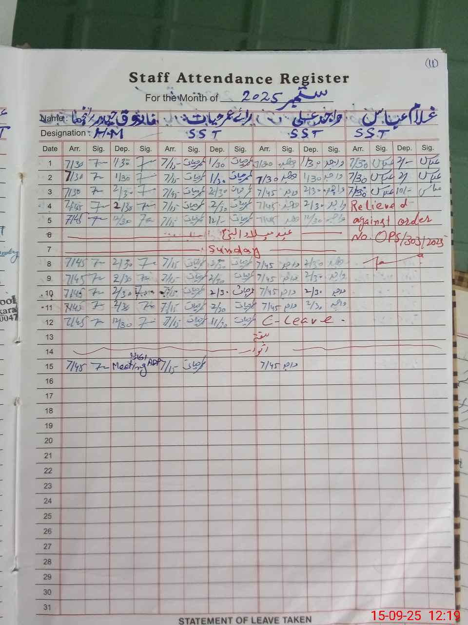 | CNIC | Full Name | Designation | R/C | Absence During Last Calender Month |