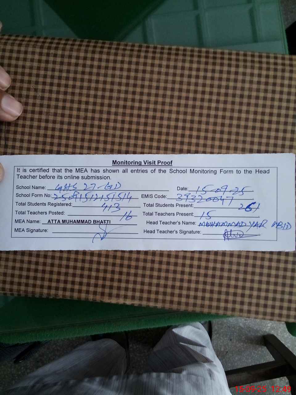 | Attendance Register | Head Teacher | MEA with School | Visit Proof |