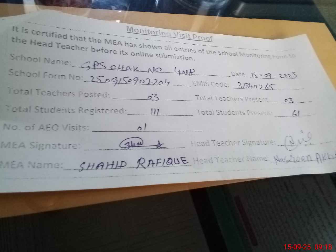 | EMIS Code: 31340265 | Name of School: GPS CHAK NO. 4/NP | |||