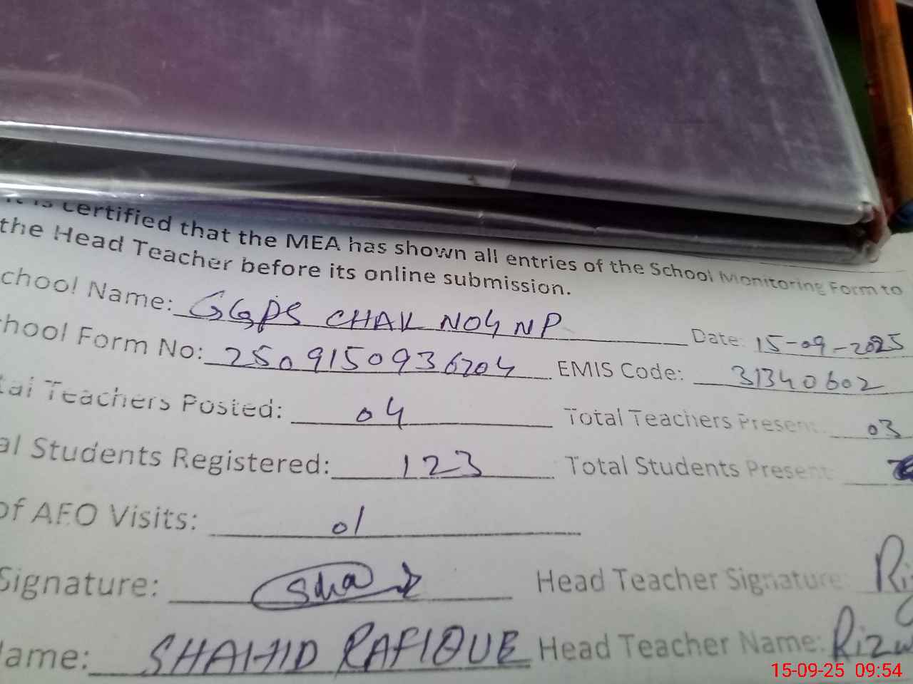 | Attendance Register | Head Teacher | MEA with School | Visit Proof |