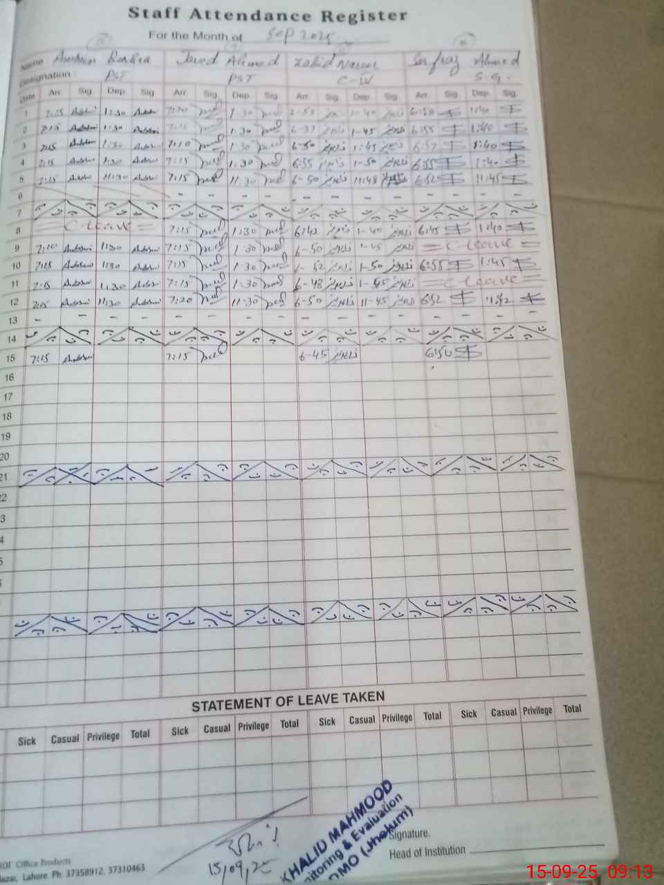 | CNIC | Full Name | Designation | R/C | Absence During Last Calender Month |