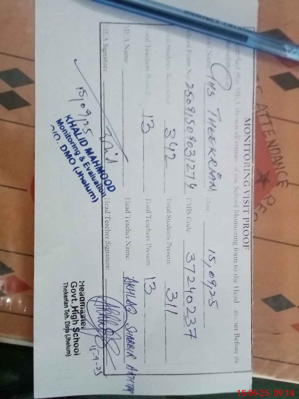 | Attendance Register | Head Teacher | MEA with School | Visit Proof |