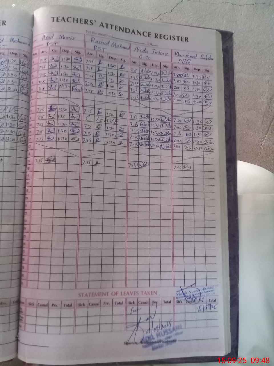 | CNIC | Full Name | Designation | R/C | Absence During Last Calender Month |