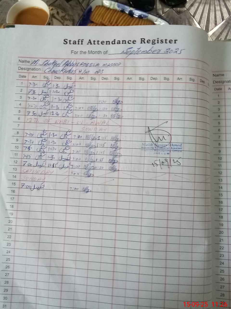 | Monitoring Date: 15-09-2025 | Start Time: 15-09-2025 10:50 AM | End Time: 15-09-2025 11:29 AM | Name of MEA: Na**** Ah**** | |
