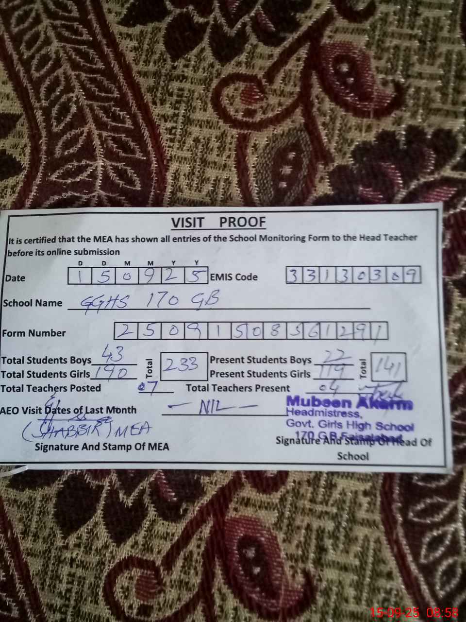 | EMIS Code: 33130309 | Name of School: GGHS CHAK NO 170 GB | |||