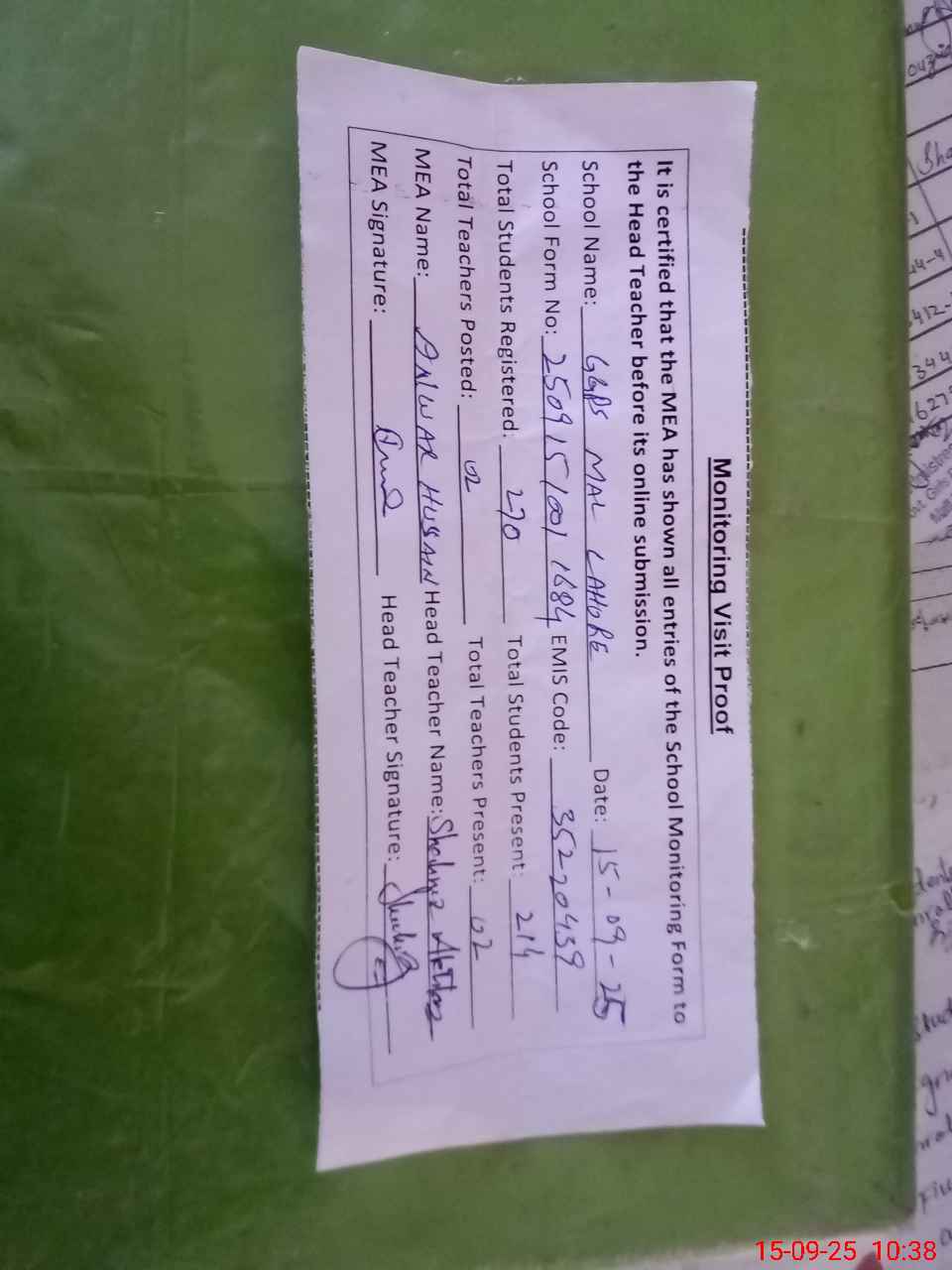 | Certified that this School was Inspected by the Undersigned MEA/DMO Today and the Information Stated Above is as Per Record. | |||||