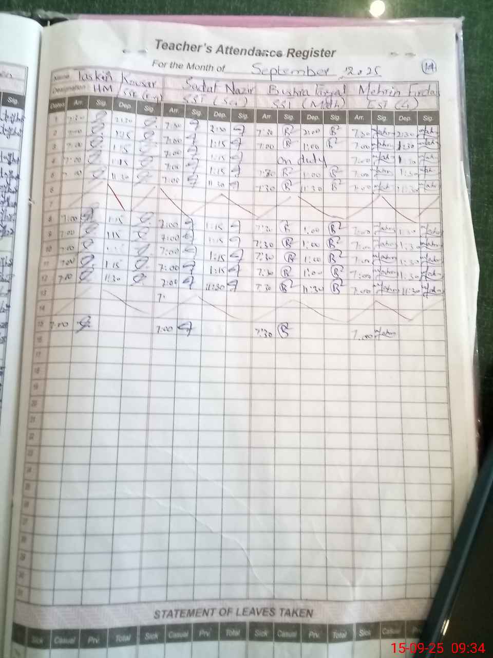 Leave Type | Remarks for Today (Leave,Training, Exam,Absent,Late, Other Duty) |