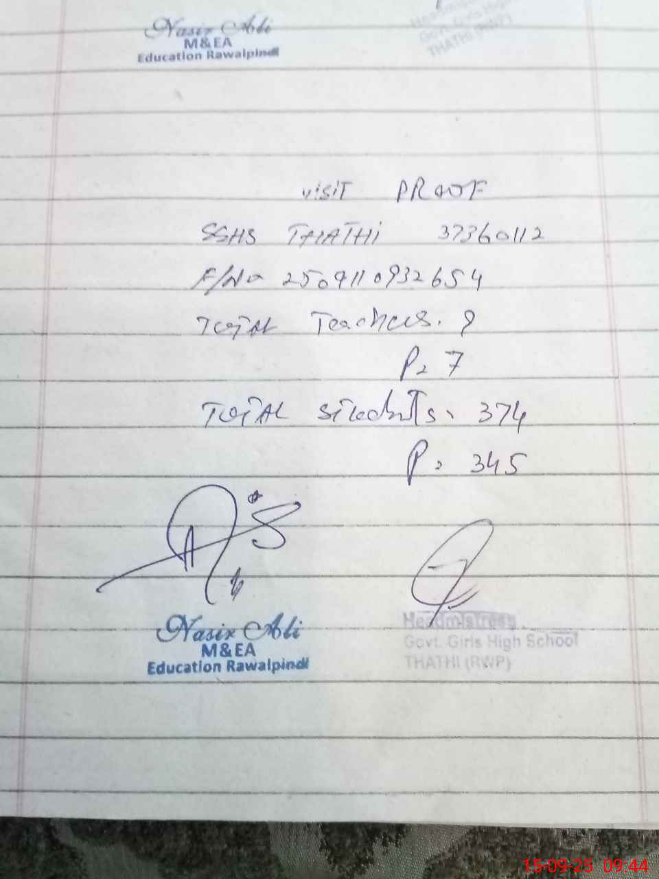 | Attendance Register | Head Teacher | MEA with School | Visit Proof |