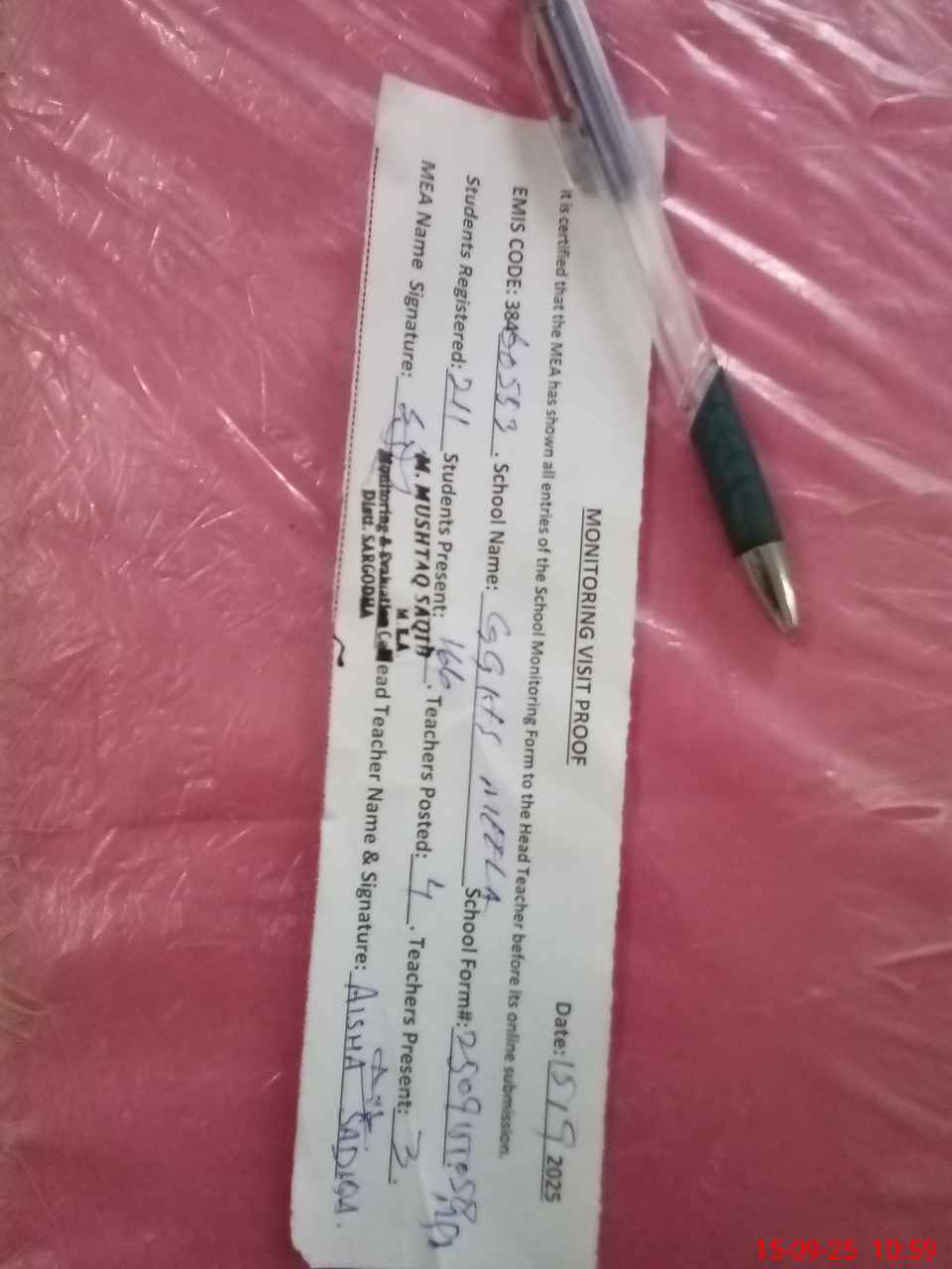| Name: If**** Sa**** Designation: (School Headmaster's/Headmistress's) SST Phone/Cell Number: 03**** |