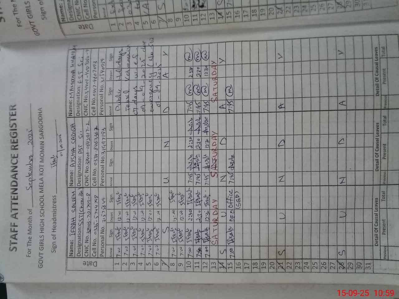 | CNIC | Full Name | Designation | R/C | Absence during last cal. month |